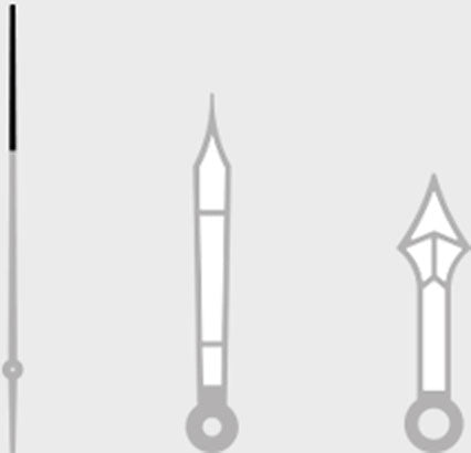 AVIATORの時計の針を高品質に仕上げるためには、20以上の工程を経なければなりません。中でも最も重要な作業は、スタンピング、キャノンホールの穴あけ、様々な技法による針のカット、ヘッドと針のボディの成形などです。金属片から作られた針は研磨され、ガルバニック・バスで着色され、最後に蓄光塗料を塗布していかなる時間帯もお使いいただけるよう仕上げます。針はデザインされた後、厳格な品質管理が行われ、文字盤の上に組み立てられます。