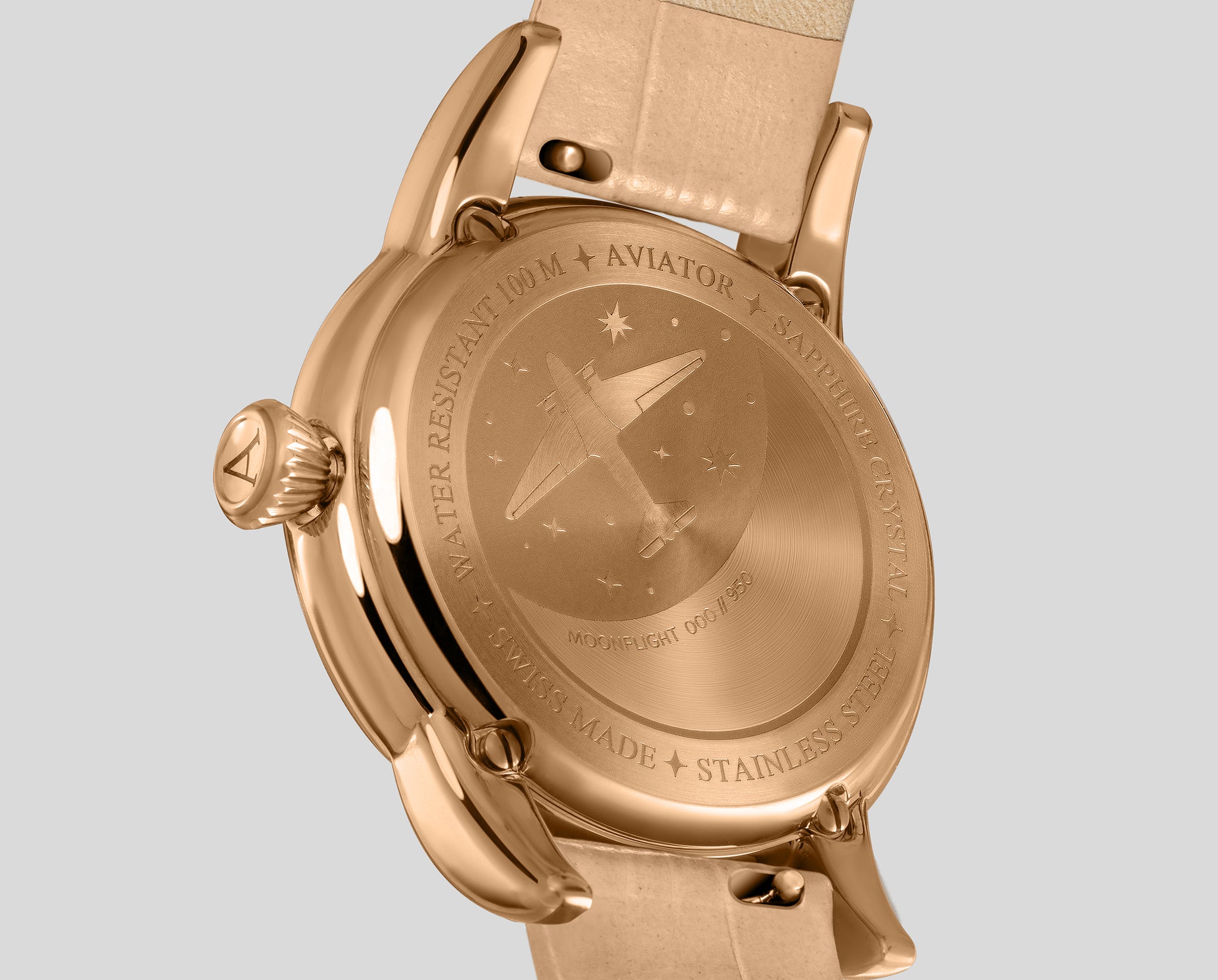 飛行の黄金時代は、旅の概念を全く違う次元のものへ変化させました。鋼鉄製の飛行機は、デザイン性を高め、客室乗務員の制服もオートクチュールファッションに変わりました。ダグラスDC-3でのミッドナイトフライトでは、窓に映る月が神秘的に船内を照らしていました。MoonFlightは、内装をイメージしたヴィンテージカラーライン、洗練された流線形デザイン、太陽光線をイメージしたギヨシェ加工のフェイスがこの時計のコンセプトそのものです。シェルで造形された雲の向こうには、月と夜空が美しく表現されています。もうお気づきかもしれませんが、ダグラスDC-3の窓から見える景色が、時計のフェイス全体でデザインされているのです。