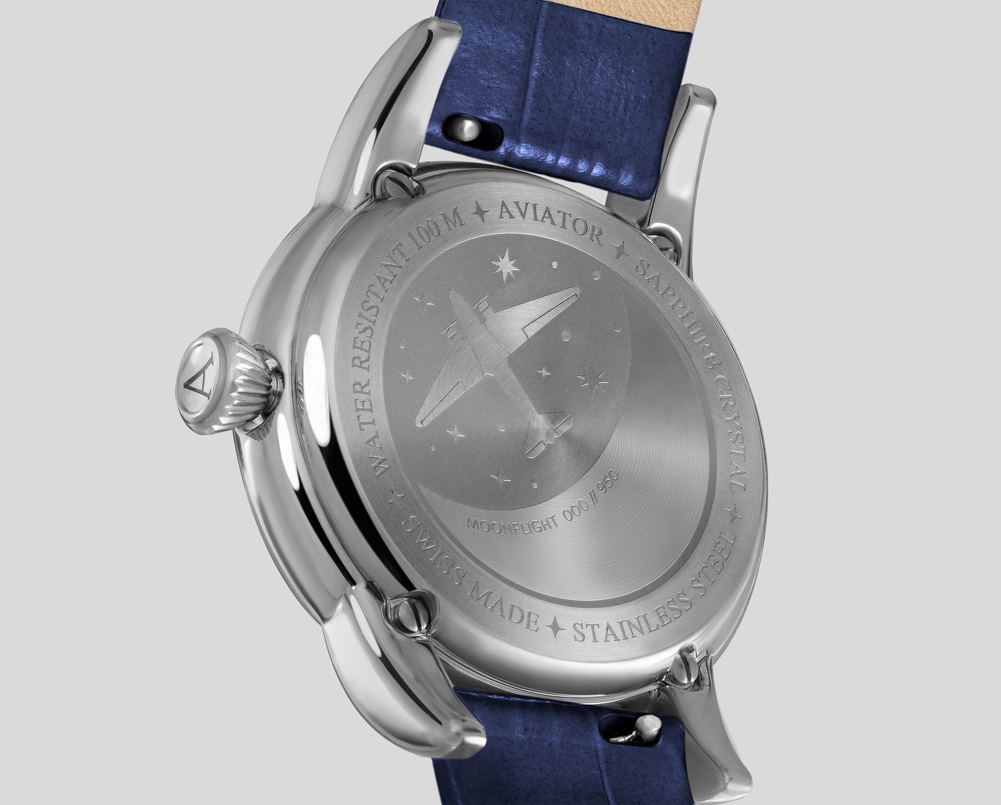 すべてのAVIATORウォッチの裏にはストーリーがあります。 MoonFlightを裏返すと、ケースの裏側に、月の女性らしい神秘に導かれた豪華なダグラスDC-3の彫刻があります。複数の仕上げは、彫刻に命を吹き込み、その凹面の形状は信じられないほど絹のような感触がします。ステンレス鋼のネジで固定された裏蓋は、最大で100メートル防水をになっています。