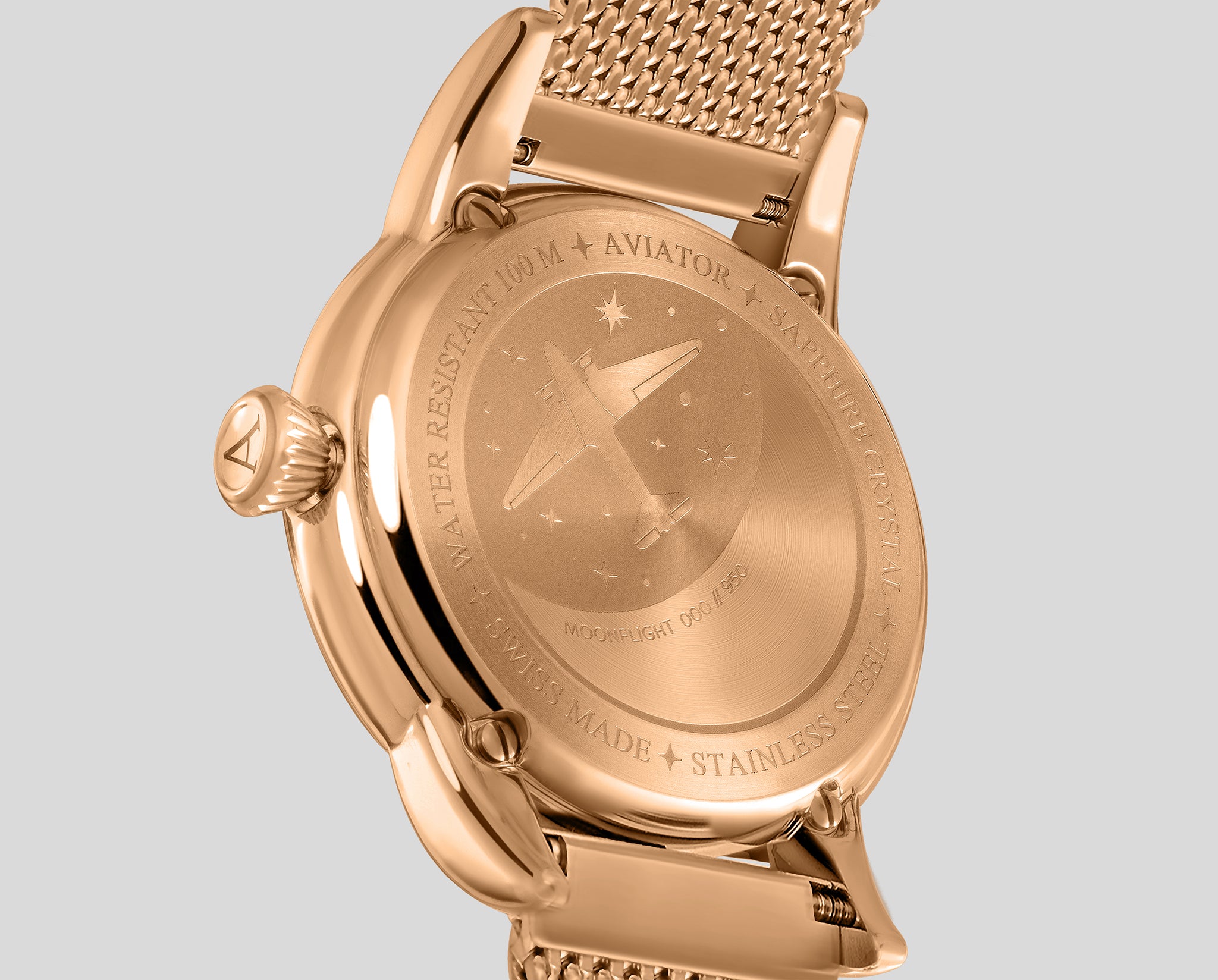 飛行の黄金時代は、旅の概念を全く違う次元のものへ変化させました。鋼鉄製の飛行機は、デザイン性を高め、客室乗務員の制服もオートクチュールファッションに変わりました。ダグラスDC-3でのミッドナイトフライトでは、窓に映る月が神秘的に船内を照らしていました。MoonFlightは、内装をイメージしたヴィンテージカラーライン、洗練された流線形デザイン、太陽光線をイメージしたギヨシェ加工のフェイスがこの時計のコンセプトそのものです。シェルで造形された雲の向こうには、月と夜空が美しく表現されています。もうお気づきかもしれませんが、ダグラスDC-3の窓から見える景色が、時計のフェイス全体でデザインされているのです。