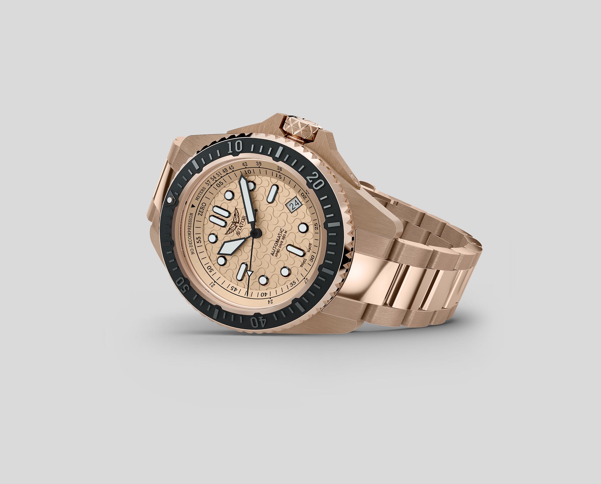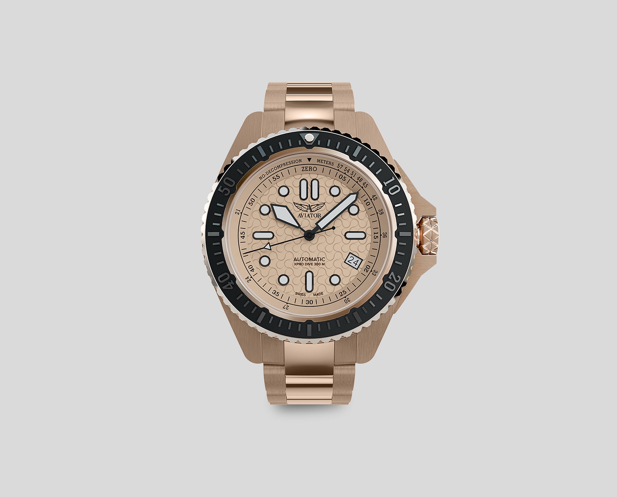 AVIATOR XPRO DIVE 300 AUTOは、海と空という二つの環境で卓越した性能を発揮するデュアル・エンバイロメント・ツールウォッチです。 スイス製高精度自動巻きムーブメントを搭載し、あらゆる環境下で確かな信頼性を提供します。